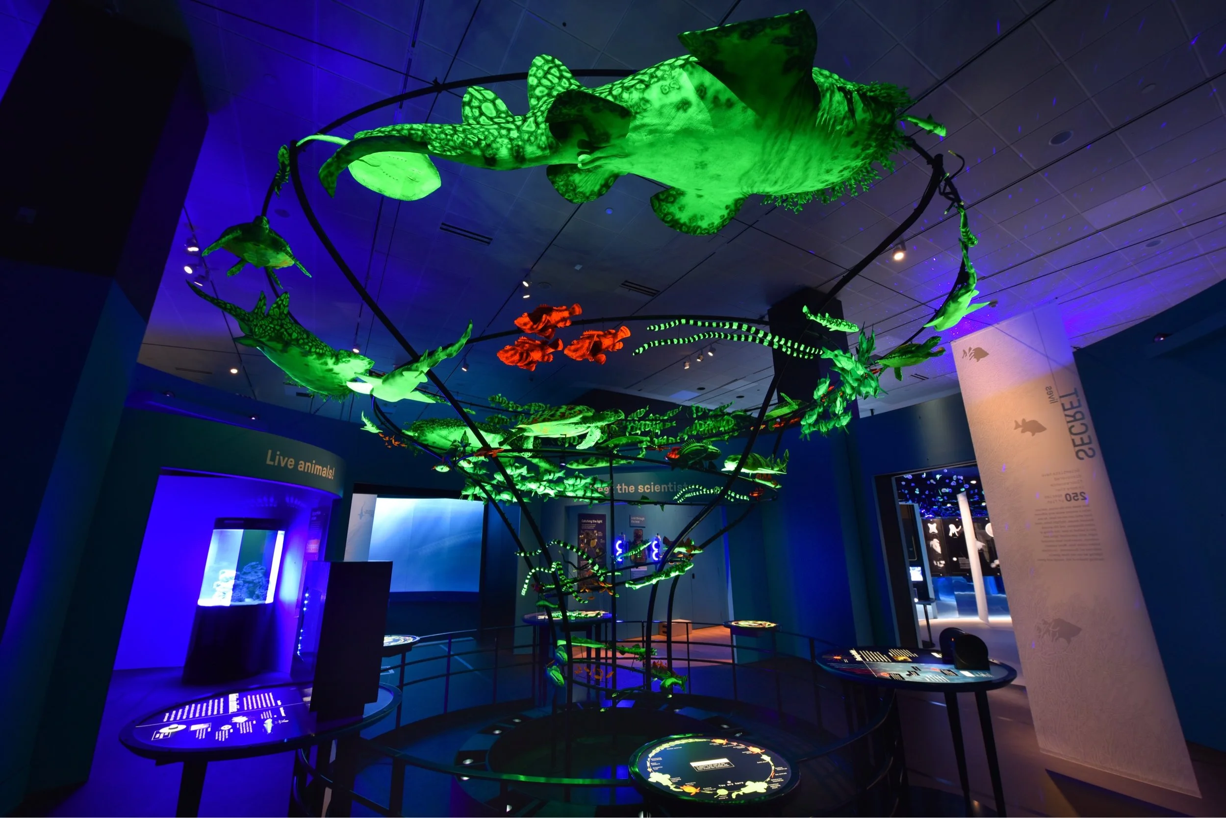 Over 200 individual models were made of about two dozen species. The swirling funnel of neon fish was lovingly dubbed “fishnado,” a name that found its way into several promotional articles about the exhibit. The exhibit is currently traveling, appearing at museums around the US.